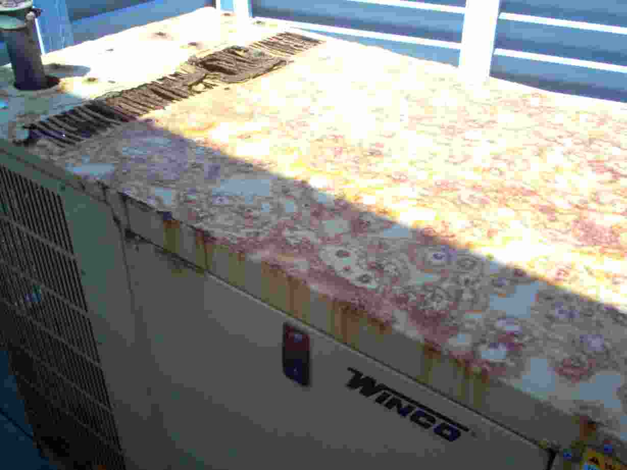 The rust has progressed since the last photos... New Cover Installed August 2, 2005 ... at 118.3 hrs on the meter on the generator... photos.
